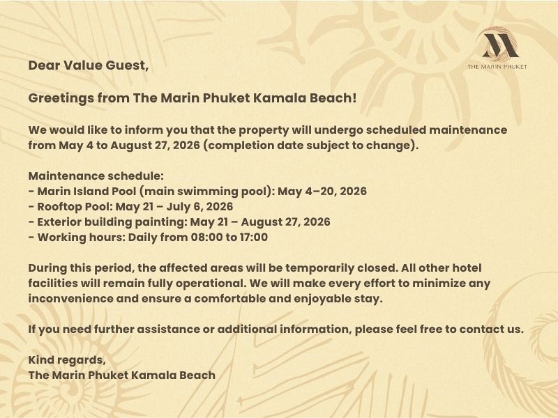 During this period, the affected areas will be temporarily closed. All other hotel facilities will remain fully operational. We will make every effort to minimize any inconvenience and ensure our guests continue to enjoy a comfortable and pleasant stay.